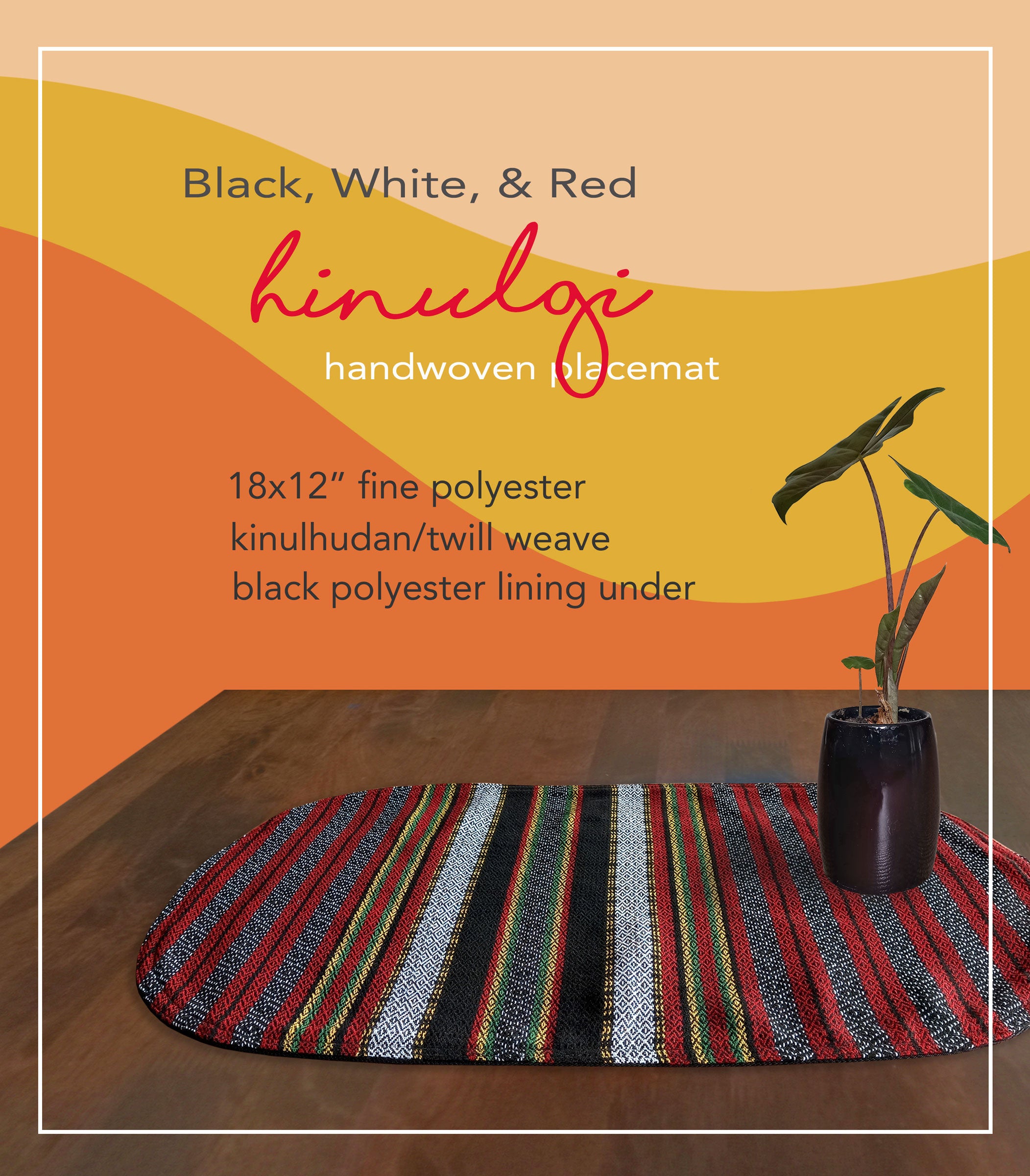 Handwoven placemats made from fine polyester. Backed by polyester linen lining. Handwoven and sewn in Ifugao.