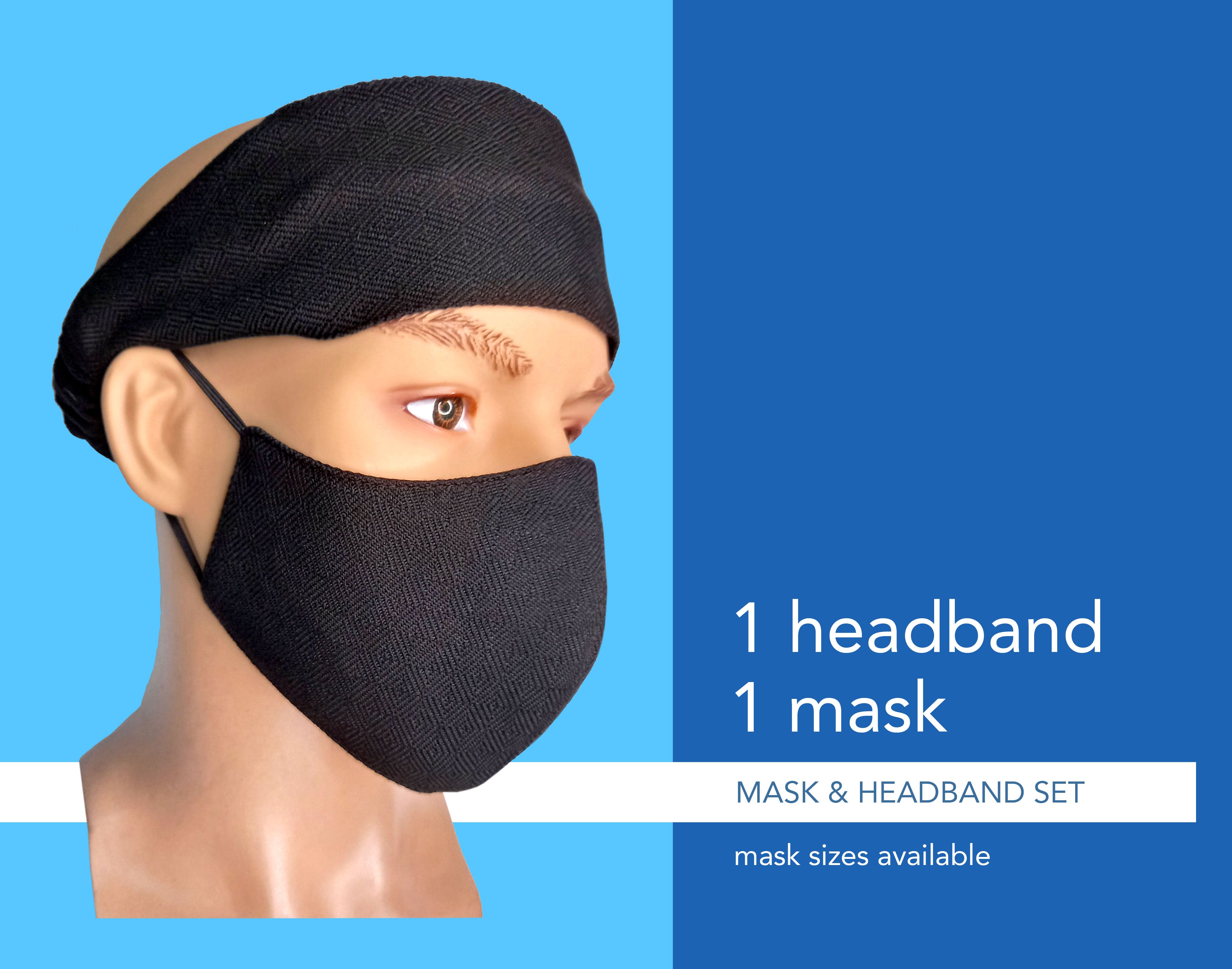 Mask and headband made from same Ifugao weave. Mask has non-woven polypropylene layer for filtration and 100% polyester inner lining.
